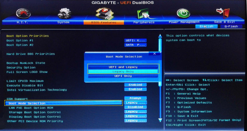 点击BIOS功能-> CSM支持->启动模式的选择,并在“启动模式选择”,将出现一个弹出的窗口回车,你应该选择“UEFI和遗产”或“遗产”。