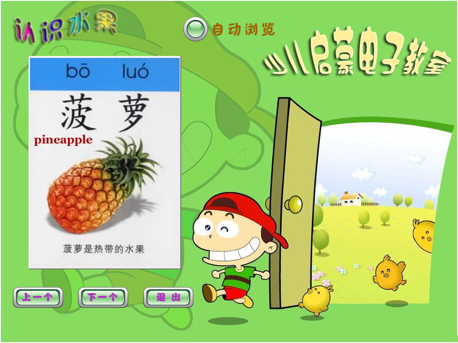 5.认识水果----列出了常见的几十种水果,让孩子认识它们。