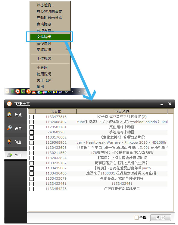 在电脑屏幕右下角的托盘任务栏上,右键点击飞速图标,然后点选“文件导出”,勾选视频后点击“导出”按钮,就可以了!