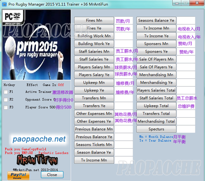 英式橄榄球经理2015修改器+36 v1.11具有修改游戏中对手得分0,本方得分500等36项实用功能,对应版本v1.11使用,作者MrAntiFun,东坡下载为您提供下载服务和使用说明。
