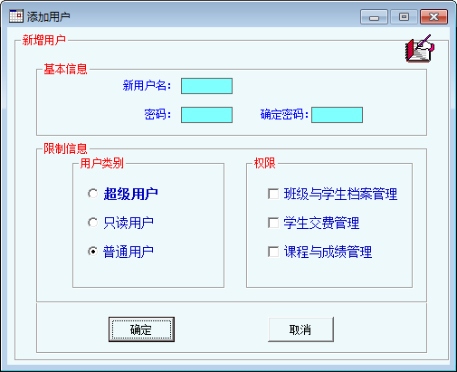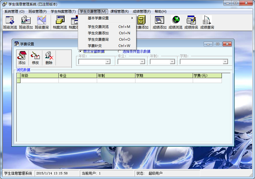 4、学费管理子功能实现了本学期所有学费的设置、修改,以及每个学生交费信息的管理、查询;