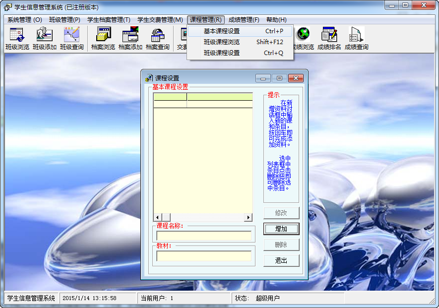 5、课程管理子功能可以设置本学期全校开设的课程和配套的教材,以及进一步详细指定各个年级的开设的课程信息 ;