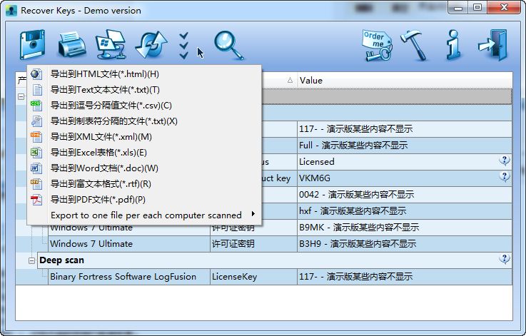 利用Recover Keys您可以自我保护并且备份您的密钥了!密钥恢复软件 可以迅速地分析您系统中的 4500+ 多种各类软件程序,并且生成一份软件激活密钥的清单。然后您就可以保存、备份、打印、或者导出为(Word文档,Excel表格,PDF文件,HTML格 式,CSV格式,XML格式)的许可证信息。由于界面友好,选项众多,所以无论是专业人士还是没有经验的用户都能够自如地使用密钥恢复软件。