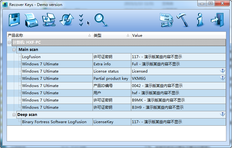 -作为附加功能,本软件还可以恢复注册信息,比如用户名、公司、产品ID识别码验证密钥等信息。