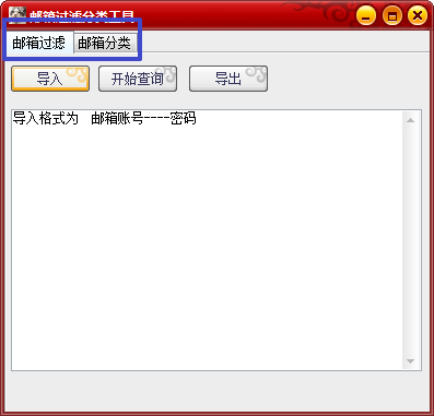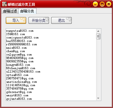 邮箱过滤分类工具是一款绿色、免费、好用的集邮箱过滤、分类于一体的小工具。软件支持国内所有主流邮箱,包括163、126、sohu、sina、21邮箱等,多线程运行,完美实现邮箱过滤、分类操作。欢迎下载使用!