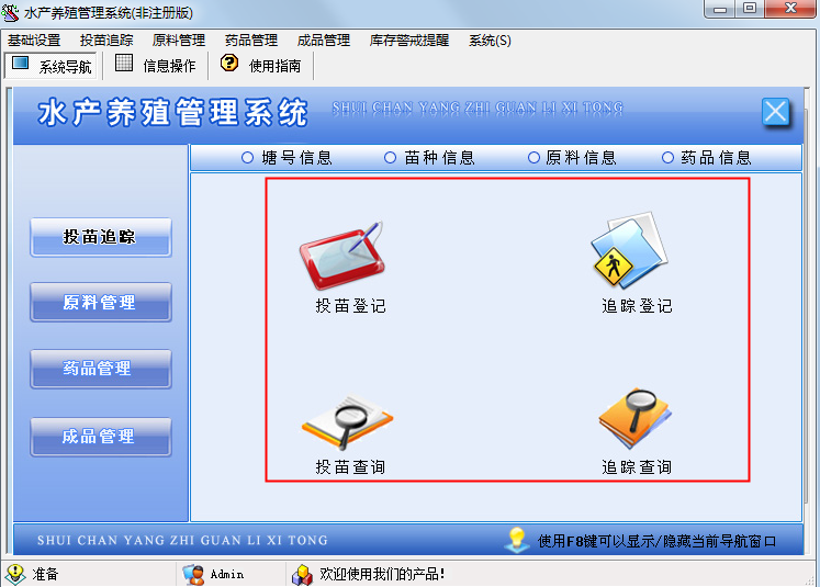 水产养殖管理系统是一款适用于水产养殖行业的软件。该系统操作简单,让您对养殖信息和库存信息一目了然。投苗登记功能,准确记录投苗信息,追踪登记,可以随时掌握各个池塘投养的情况,提醒功能及时提示您即将缺货的原料和药品,满足您日常管理的需要。