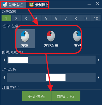 选择鼠标连点或录制回放,设置相关功能,使用热键或直接点击开始即可