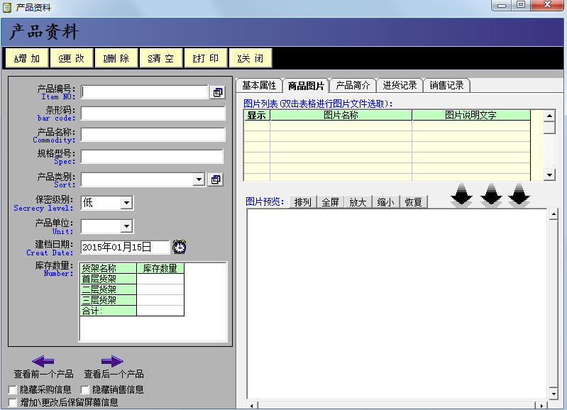 系统定位:适用于外贸公司、中介公司及产品种类多的商业企业的产品库管理。 样品资料: 定义样品的基本信息(可以附加样品多个图片); 基本信息:样品编号、样品名称、条形码、规格型号、颜色、包装、体积; 进销记录:进货时间、供应商、计价单位、计价币种、单价、采购数量、采购金额; 销售时间、客户 、计价单位、计价币种、单价、销售数量、销售金额。