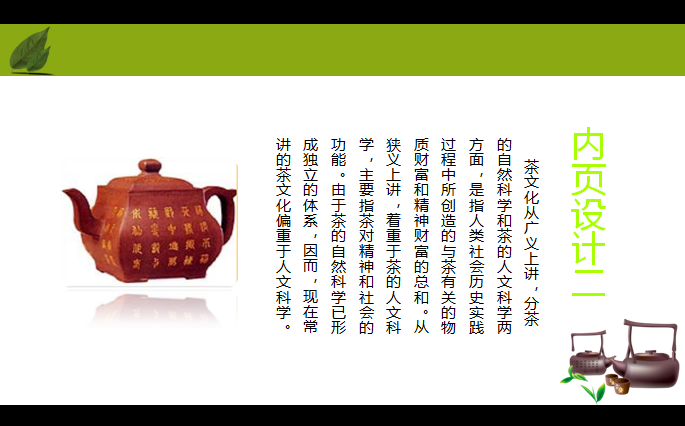 今天小编和大家分享的是一个茶文化ppt模板,具体为中国茶道文化基础知识培训ppt模板,绿色清新风格,ppt格式,希望这个中国茶道ppt模板大家会喜欢,有需要的朋友可立即下载此文档。