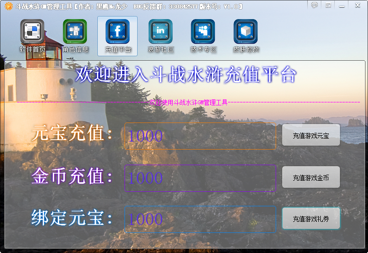 斗战水浒GM工具提供充值平台,充值元宝、游戏金币和游戏礼券,充值很便利。