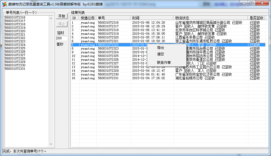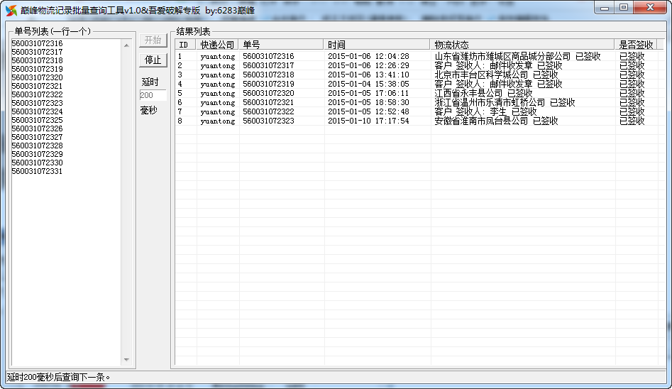 巅峰物流记录批量查询工具是一款简单易用的物流记录批量查询工具,软件适合做电商的朋友使用,可以快速批量的查出快递公司,时间、物流状态等信息,巅峰物流记录批量查询工具的原理是调用快递100官网的接口,支持批量查询。