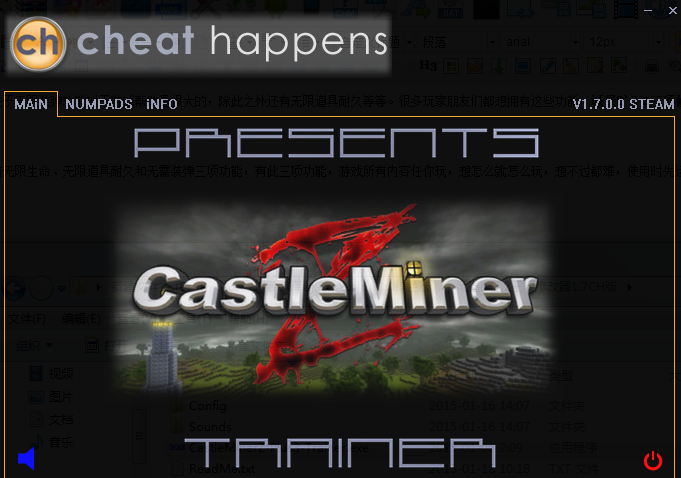 城堡矿工Z三项修改器1.7是CH为本游戏1.7版本制作的一个修改器,有无限生命、无限道具耐久和无需装弹三项功能,有此三项功能,游戏所有内容任你玩,想怎么就怎么玩,想不过都难,使用时先运行游戏,再启动修改器,然后根据相应按键选择相功能即可。