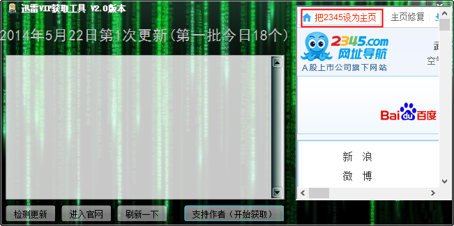 打开软件后点击“支持作者(开始获取)”,然后在右边点击把2345设为主页即可获取免费的迅雷会员账号。