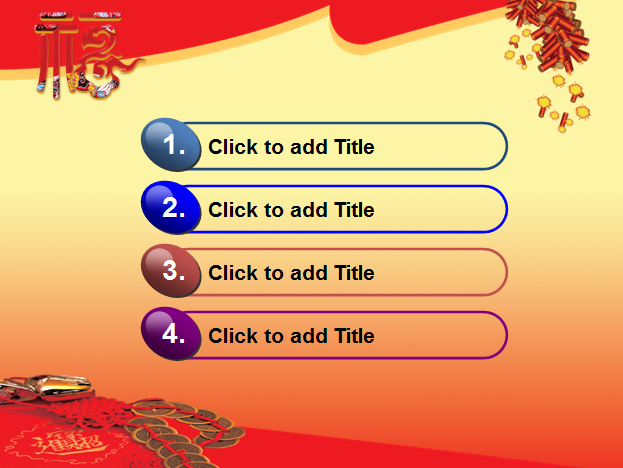 这里分享的是2015年终总结新年计划ppt模板,红色喜庆风格,以红色为主调,福字,鞭炮,金元宝为背景,非常的适合用在年底总结,新年计划等幻灯片演示, 大家可以进行免费的下载。