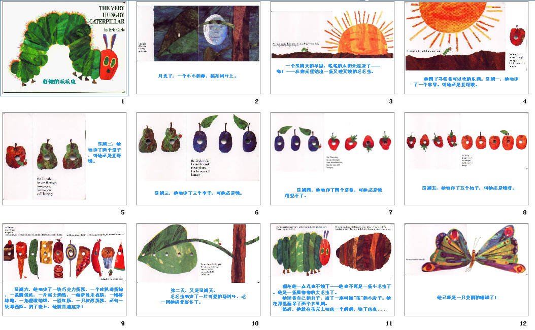 月光下,一个小小的卵,躺在树叶上,一个星期天的早晨,暖暖的太阳升起来了——啪!——从卵壳里钻出一条又瘦又饿的毛毛虫。他四下寻找着可以吃的东西。