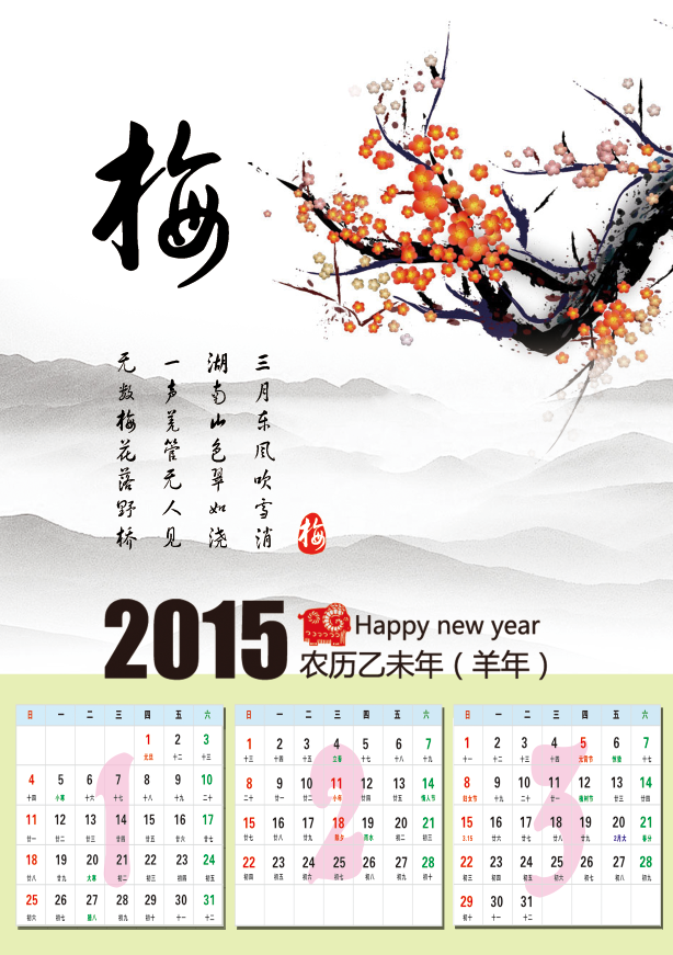 梅兰竹菊号称花中四君子,象征着傲、幽、坚、淡品质,这里给大家带来的是2015梅兰竹菊日历模板psd分层素材,需要的朋友可以免费下载2015年日历模板素材。