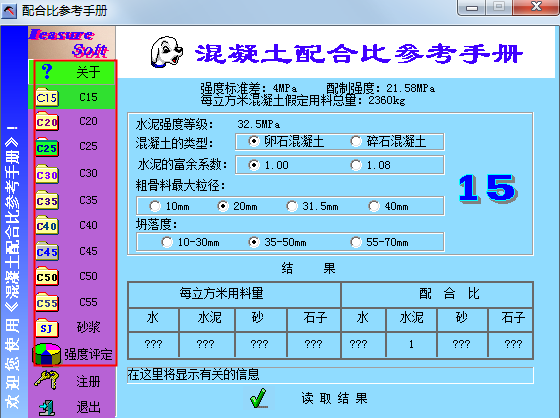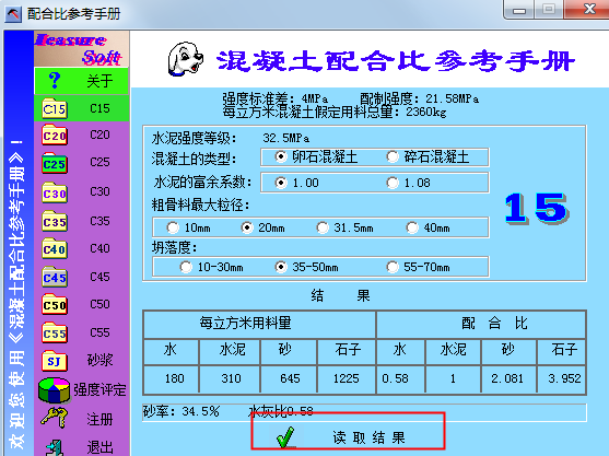 该软件使用简单,只需要选择几个数据,就可以得出混凝土的配合比(水泥,黄沙,石子和水的用量)特别好用,方便,快捷。