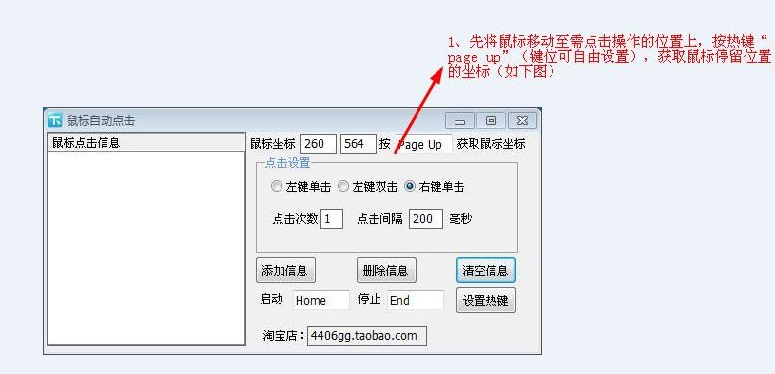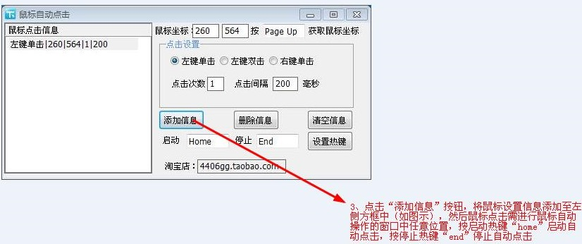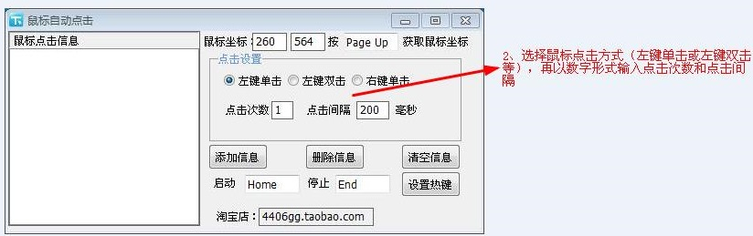 添加信息:将鼠标位置、点击方式、点击次数、点击间隔的信息添加至左侧方框内