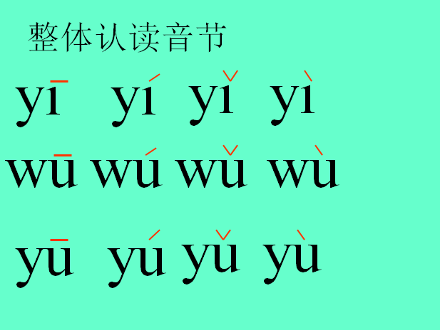 3、掌握i、u、ü、yi、wu、yu的四声,能直接读出它们带调的音。