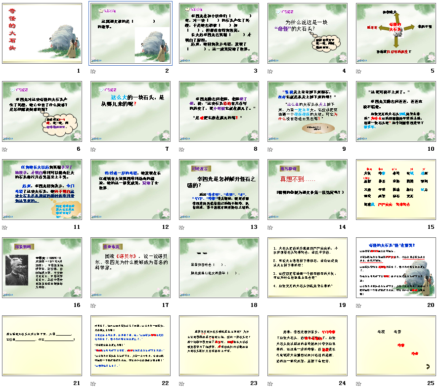 李四光是中国非常著名地质学家,奇怪的大石头讲诉的是李四光小时候对石头的思考故事,这么大的一块石头是从哪里来的呢?这里带来的是人教版语文三年级上册奇怪的大石头ppt课件,大家可以免费下载奇怪的大石头ppt课件直接使用。