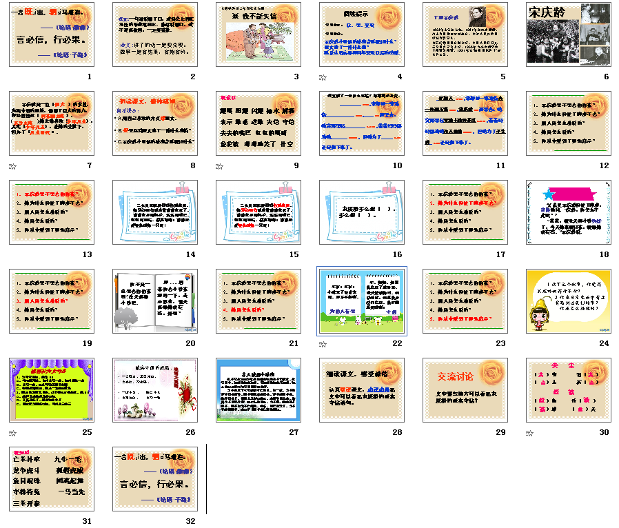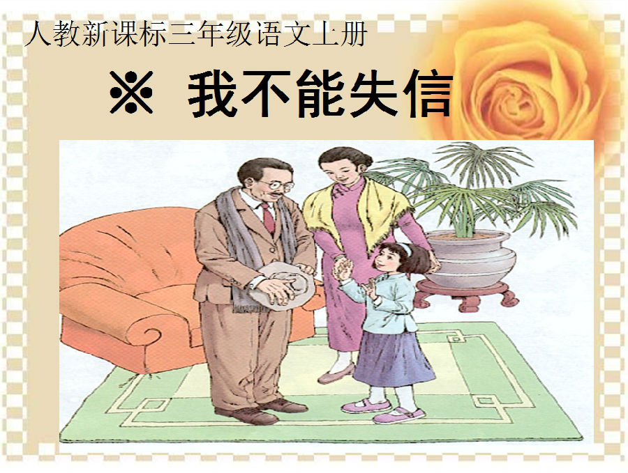 我不能失信讲诉的是在一个星期天,宋耀如一家准备到一位朋友家去,二女儿宋庆龄也很想去。她突然想起要教小珍叠花篮,爸爸妈妈都劝她改天再教,但她为了守信就留了下来。我不能失信是人教版语文三年级上册第二单元的第8篇课文,这里带来的是我不能失信ppt课件,大家可以免费下载我不能失信课件直接使用。
