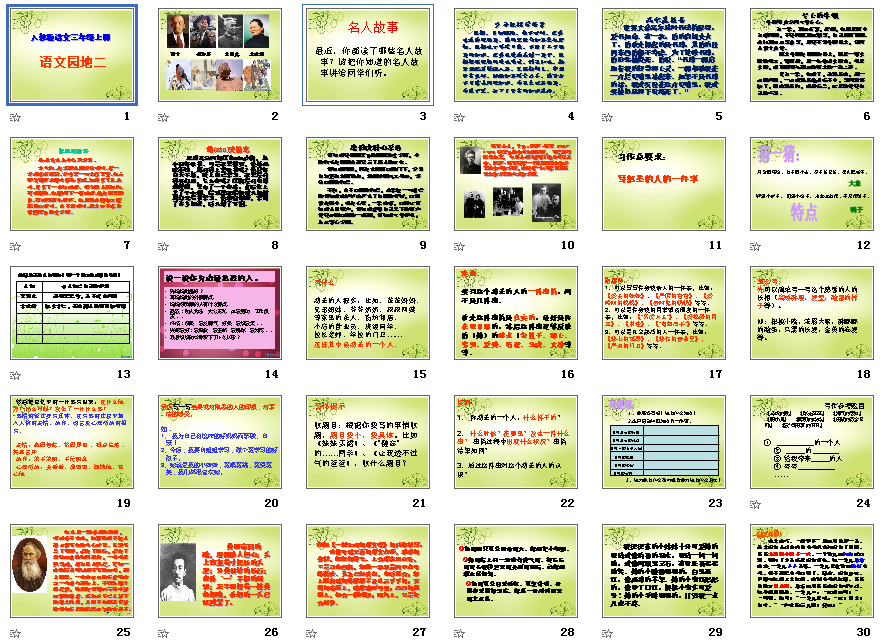 人教版语文三年级上册课件语文园地二的主题是名人故事,最近你都读了哪些名人故事?你最熟悉的名人有哪些呢?这里带来的是语文园地二ppt课件,课件介绍了一些少年包拯、高尔基、唐伯虎等名人,幻灯片共有55页,大家可以免费下载语文园地二ppt课件使用。