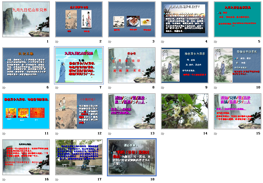 人教版语文三年级上册第三单元第9课时古诗二首——夜书所见和九月九日忆山东兄弟,九月九日忆山东兄弟是王维名篇之一,其中“每逢佳节倍思亲”更是千古名句。这里带来的是九月九日忆山东兄弟ppt课件,小编整理了2款课件,大家可以免费下载九月九日忆山东兄弟ppt课件使用。