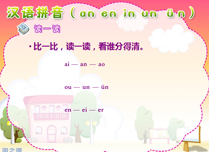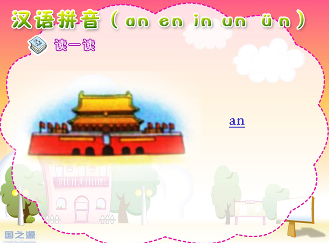 2、学习声母与前鼻韵母组成的音节,能正确拼读。读准三拼音节,复习ü上两点省写规则。