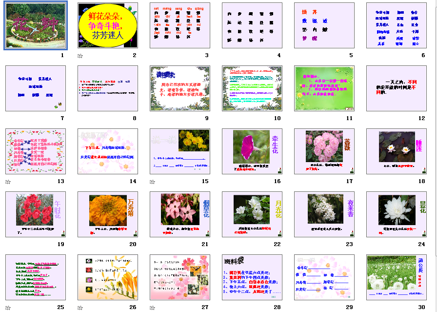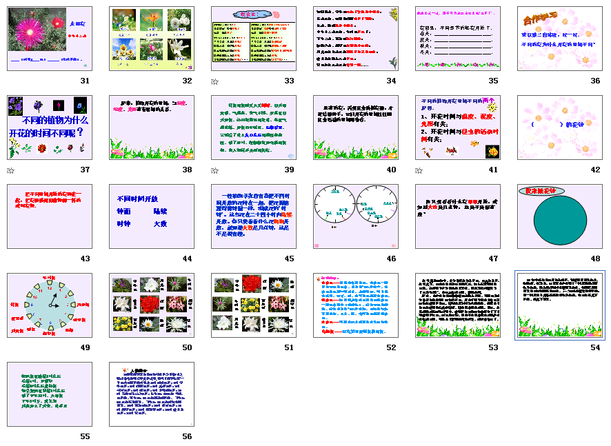 花钟是人教版小学语文三年级上册(第五册)第四单元的第13篇课文,作者列举了蒲公英、紫茉莉,丝瓜花等不同的开花时间来说明这个发现,下面是人教版语文三年级上册花钟ppt课件,大家可以免费下载花钟ppt课件直接使用。