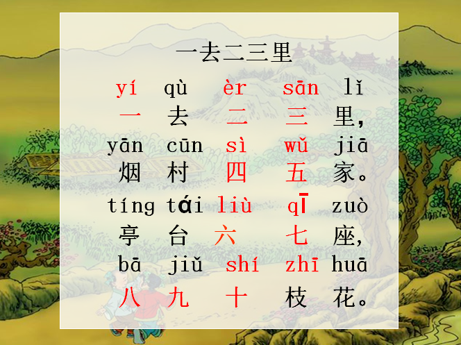 识字1一去二三里是人教版小学一年级语文上册识字(一)第一单元中的第一课,一去二三里是一首古代童谣,短短20个字,在引导学生欣赏此童谣描绘的美景外,还要认识和灵活运用十个数字。以下是小编给大家带来的人教版小学一年级语文上册,识字1一去二三里ppt课件,有需要的朋友可立即下载这个识字1ppt课件。