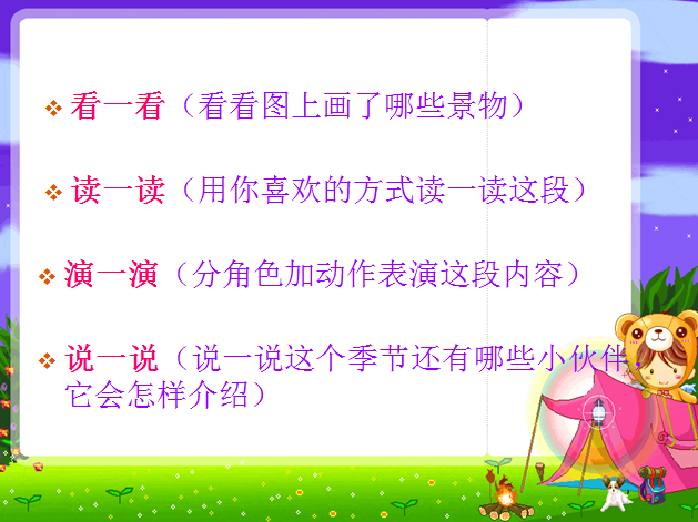 3、了解课文内容,知道一年有四季及四季的特征,产生对大自然的喜爱之情。