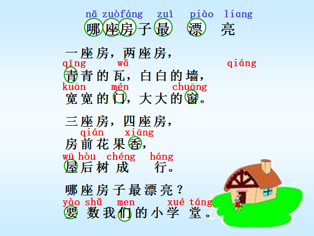 哪座房子最漂亮是人教版小学一年级语文上册课文部分第二单元第四课,哪座房子最漂亮是一首四句话诗歌,描绘了农村里新建了很多新房子,通过一问一答,说出了小学堂是最漂亮的房子。以下是小编给大家带来的人教版小学一年级语文上册,哪座房子最漂亮ppt课件,有需要的朋友可立即下载这个哪座房子最漂亮ppt。