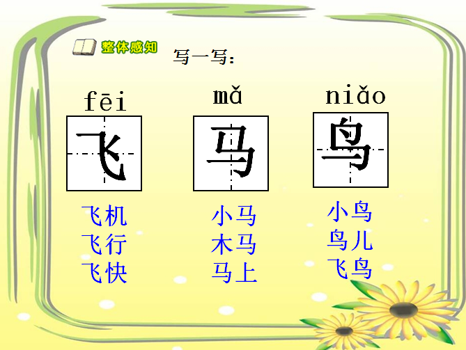 1、认识11个生字,会写“飞、马、鸟”3个字。认识1个笔画“”和5个偏旁“彡、犭、、、”。