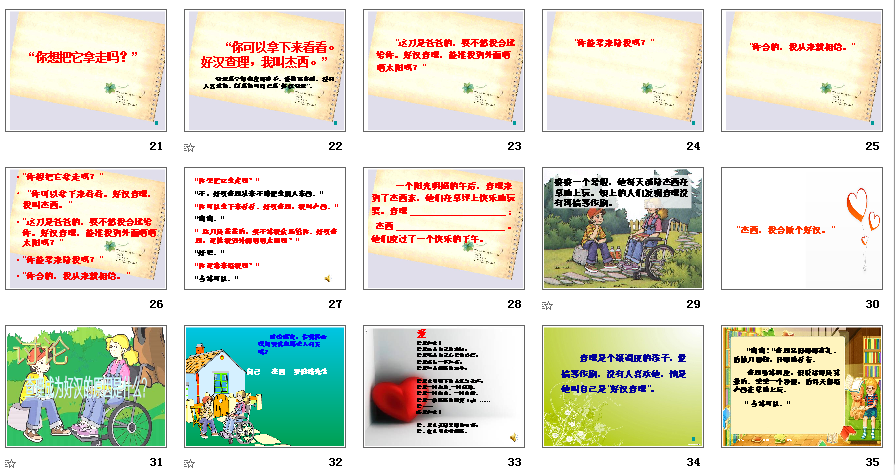 在教学中不是单调的呈现这些文字,而是借用一些平台来进行过渡,连贯,让学生写对查理“荣誉证书”,最后让学生写查理对杰西的感谢信等,借助这些平台,让学生学在其中,乐中其中。在整个教学过程中,一开始导题就让学生理解好汉形象,从生活入手,调动学生的情绪,为学习课文进行情感铺垫,然后运用了动画范读课文,创设了情境,让学生根据提示说说课文讲了一个什么故事,这样不仅降低了学生学习的难度,更让学生感受到查理与杰西的美好心灵。第二个设计是在引导学生研读杰西的话语时,让学生联系自己的实际,与杰西进行二次比较。杰西的话语其实非常简单。“你想把它拿走吗?”和“你想把它拿走?”进行比较,让学生用不同的语气读出不同的对待。“你可以拿下来看看。好汉查理,我叫杰西。”在学习杰西这二句话时,我这样引导:这句话是杰西在什么情况下说的,如果是你,你看到一个从窗台进来,你会怎样?而杰西呢,你跟杰西比一比,这一比你比出了什么?如果是你,看到这种情景,你又会怎样,你跟杰西再一次比比看,你比出了什么?这二次具有实效的比较,让我们看到了杰西的善良、宽容与大方。