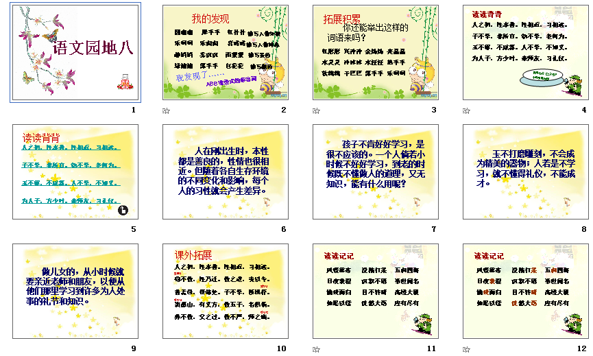 人教版小学语文三年级上册语文园地八“读读背背”选的是《三字经》,口语交际是夸夸我的同学,习作是一次自由作文,这里带来的是三上语文园地八ppt课件,大家可以免费下载语文园地八ppt直接使用。