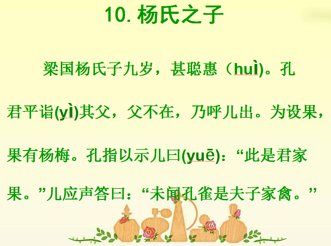 《杨氏之子》是人教版语文五年级下册课本中的课文之一,该课文选自南朝刘义庆的《世说新语·言语引》,本节内容小编为大家整理带来的是关于这篇课文的ppt课件,该ppt课件共有14页,内容详细全面,有需要的朋友只需点击本文下方的下载地址即可将这份“杨氏之子ppt课件完美版下载(免费版)”下载下来使用。