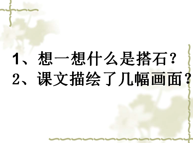 《搭石》主要讲述的是乡亲们摆搭石、走搭石等常见的生活场景,表达了作者敬佩搭石默默无闻的奉献精神,同时也赞美了乡亲们无私奉献的精神,以及为他人着想的优良传统。以下是小编给大家带来的人教版小学四年级语文上册第六单元第二十一课,搭石ppt课件,有需要的朋友可立即下载这个搭石ppt。