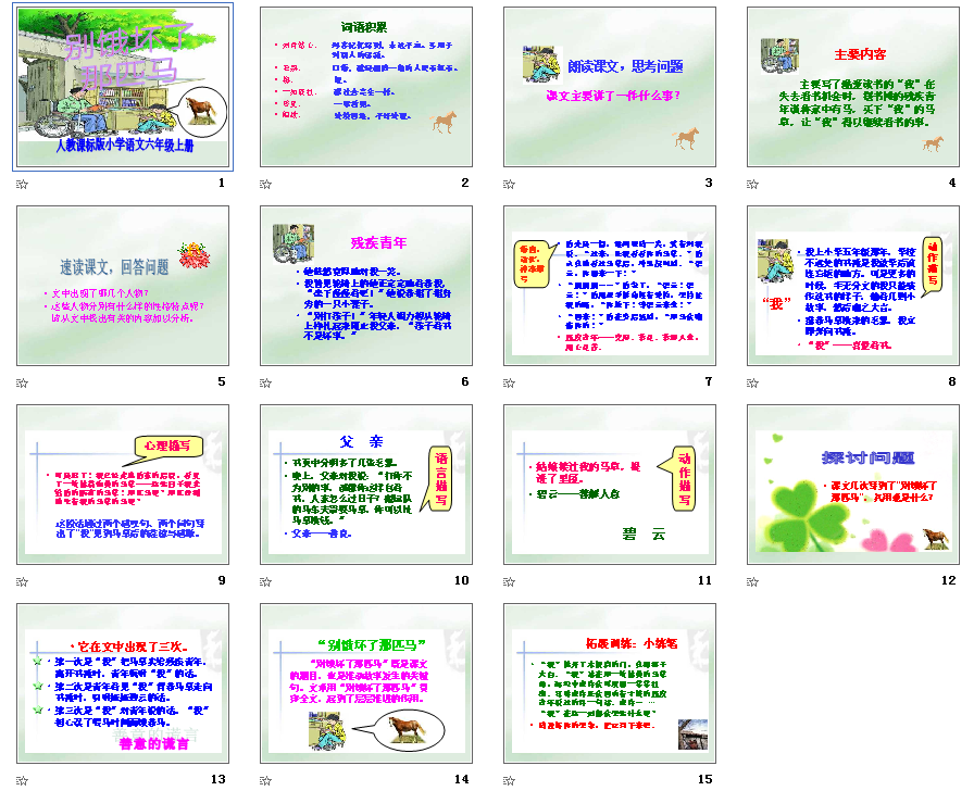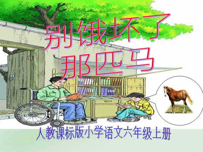 《别饿坏了那匹马》写的是善意的谎言的故事,摆书摊的残疾青年谎称家中有马,买下“我”的马草,让“我”继续看书的事。别饿坏了那匹马是一篇略读课文,是人教版小学语文六年级上册第三单元第10课,下面带来的是别饿坏了那匹马ppt课件,朋友们可以免费下载别饿坏了那匹马ppt教学。