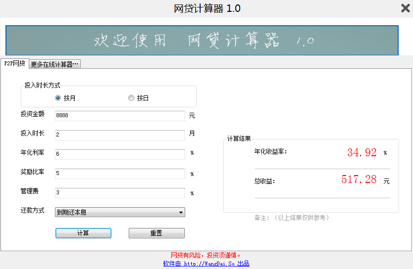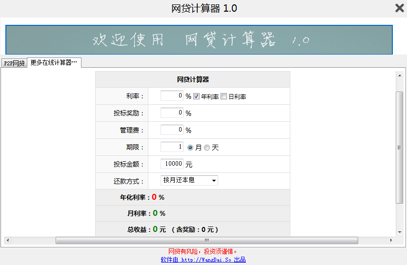 网贷计算器是一款绿色小巧、简单易用的P2P网贷计算工具。该软件可方便快捷计算出网贷收益效果,支持按月或按日计算。欢迎下载使用!