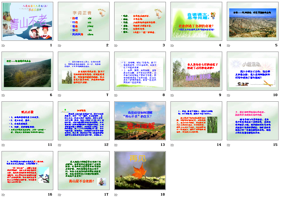 《青山不老》讲诉的是一位老人用15年的时间,在恶劣的自然条件和生活条件下在晋西北奇迹般地创造了一片绿洲,这是人教版语文六年级上册第四单元第16课的略读课文,这里带来的是青山不老ppt课件,大家可以免费下载青山不老ppt教学使用。