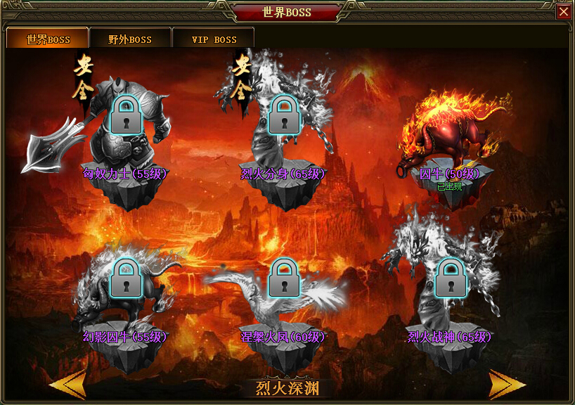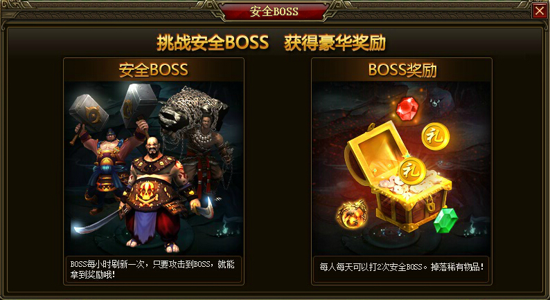 每张地图前两个BOSS为安全BOSS,玩家在安全BOSS地图不可PK。所有攻击到BOSS的玩家都会获得相应奖励!