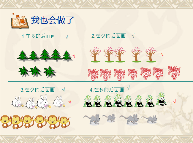 《比多少》将数学与现实生活联系起来,通过多种方法对事物进行比较,对于刚进入一年级的学生,能促进其学习数学的兴趣和信心。以下是小编给大家带来的人教版小学一年级数学上册第一课数学准备课ppt,比多少ppt课件,有需要的朋友可立即下载这个比多少ppt。