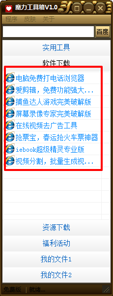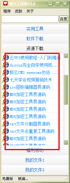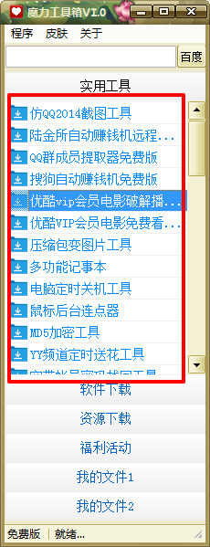 魔力工具箱是一款集合了全网各类热门、好用的工具于一身的全能型软件。其中包括了优酷VIP破解、二维码生成器、网页邮箱提取器等实用工具,同时还有相关热门资源下载,如相关软件源码等。绝对实用,包你满意。欢迎下载体验!