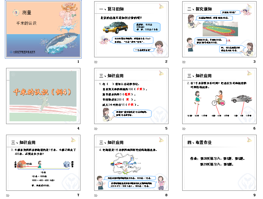 千米也是我们在生活中经常会使用的长度单位,人教版小学数学三年级上册数学第三单元3.2.1节是千米的认识,这里带来的是千米的认识ppt课件,共计9页,大家可以免费下载千米的认识ppt教学使用。
