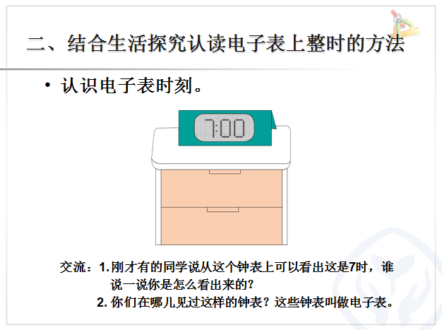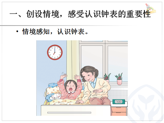 《认识钟表》本节课主要让学生先认识钟面上的时针和分针,区分清楚后认识钟面上的整时数,并结合日常生活作息时间,培养珍惜时间的态度和合理安排时间的良好习惯。以下是小编给大家带来的人教版小学一年级数学ppt课件,认识钟表ppt课件,有需要的朋友可立即下载这个认识钟表ppt。