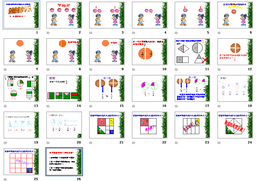 《分数的初步认识》这节内容是分数的初步认识,理解分数的含义并在理解分数含义的基础上学会比较分数的大小,为学生以后学习的小数认识、性质及分数的意义等内容教学奠定基础。这里带来是人教版小学数学三年级上册第八单元分数的初步认识ppt课件,需要的朋友k可以点击下面的地址免费下载分数的初步认识ppt。