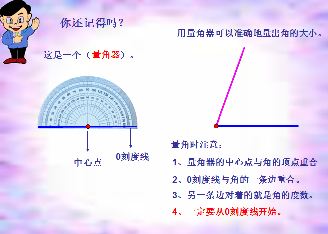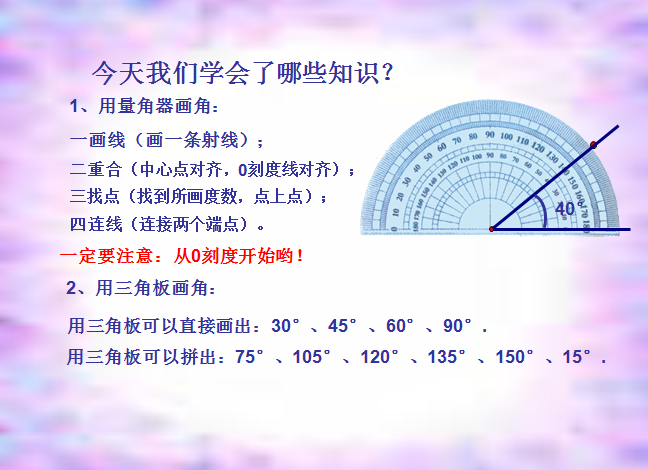《画角》在认识量角器和角的基本分类的基础上,借助三角板,按照画角的步骤正确画出指定度数的角以及一些特殊度数的角。以下是小编给大家带来的人教版小学四年级数学ppt课件,画角ppt课件,有需要的朋友可立即下载这个画角ppt。