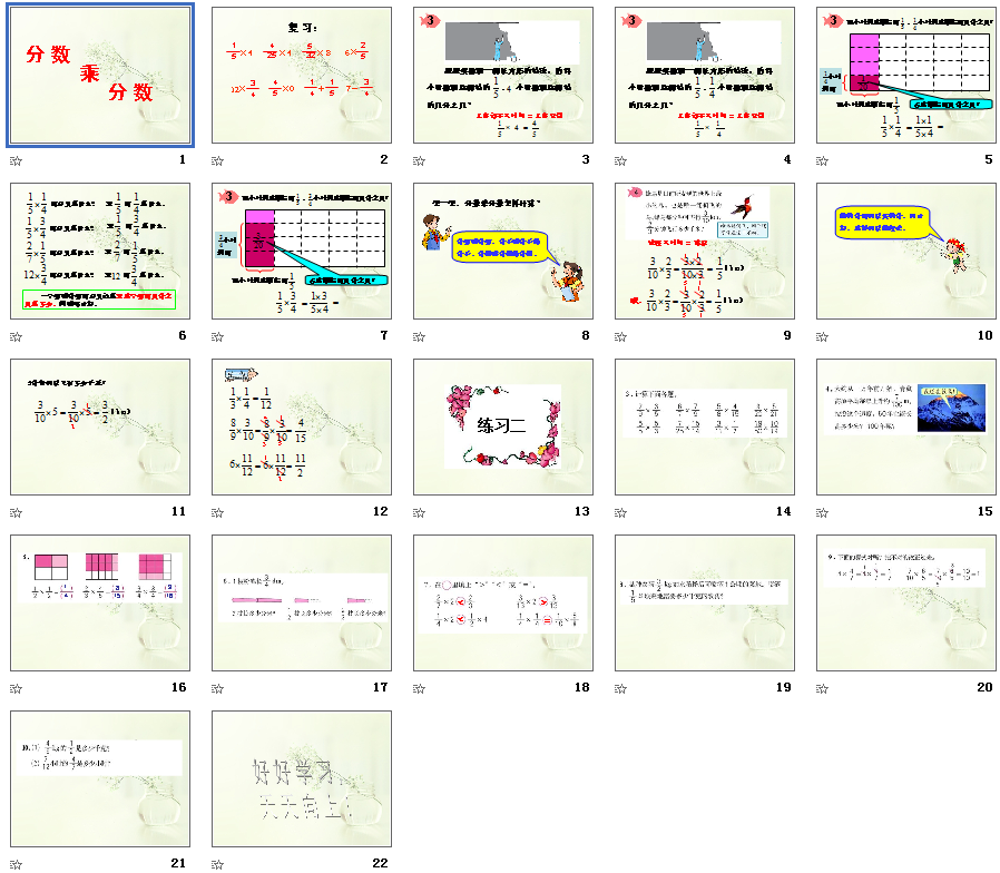 《分数乘分数》是在整数乘法、分数的意义和性质的基础上进行教学的,同时又是学习分数除法和百分数的重要基础。在教学中充分借助学生已有的知识基础,通过观察、涂画、比较、归纳等活动,通过例题的直观操作,通过知识的迁移帮助学生理解了分数乘分数的意义,初步掌握了分数乘分数的计算方法。这里分享的是分数乘分数ppt课件,需要的朋友可以免费下载分数乘分数ppt教学使用。