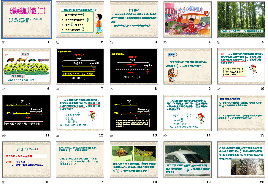 分数乘法解决问题二是人教版小学数学六年级上册第一单元的一节内容,要培养学生分析问题和解决问题的能力,应从信息的全局着手,整体分析条件与问题的关系;再深入分析各个分率的具体含义——分率的单位“1”是什么,分率表示的具体内容是什么;然后利用分析法和综合法,将整个问题进行全面地整理。这里带来的是分数乘法解决问题二ppt课件,大家可以免费下载分数乘法解决问题二ppt教学。