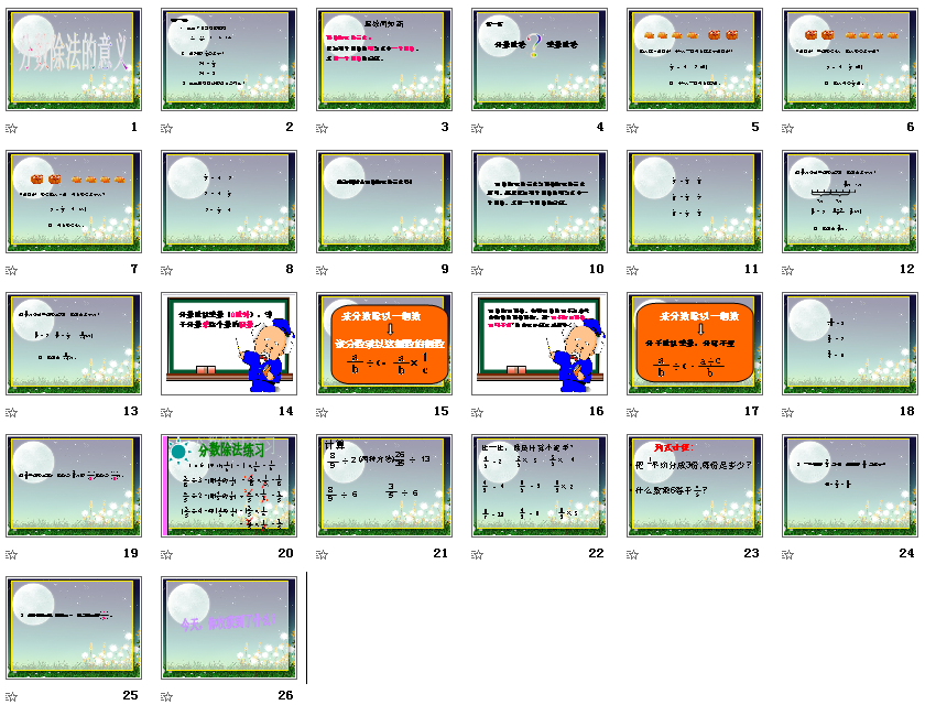 《分数除法的意义》是让学生在自身实践探索的过程中发现意义、找到方法, 通过让学生联系生活实际,创设问题情境,较好地体现了学生学习的主体性,沟通了数学与生活实际的联系,使学生认识到“数学”是生活中的数学,是有用的数学。这里带来的是分数除法的意义ppt课件,大家可以免费下载分数除法的意义ppt教学使用。